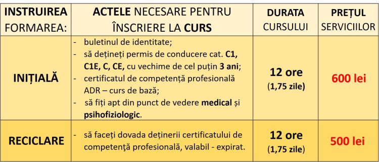 Notă: Pot fi înscriși la cursul specializat cisternă doar candidații care au urmat cursul de bază!